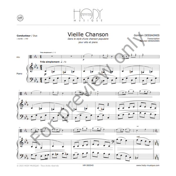 Cette pièce est une transcription pour alto et piano, récemment effectuée par la fille du compositeur, Marybel. Gontran Dessagnes écrivit un recueil de cinq morceaux pour piano seul, les Juvéniles, au tout début de sa carrière de compositeur en 1949 à Alger, à l'occasion de la naissance de son premier enfant, Nicole. La Vieille chanson est l'un d'entre eux, affirmant le goût prononcé du compositeur pour les airs d'allure populaire. Sur le modèle des Scènes d'enfants de Schumann, il peint dans chacune de ces courtes pièces, un moment de la vie familiale, faisant certainement appel ici à ses propres souvenirs d'enfance à Cholet, sa ville natale : ces vieilles chansons qui résonnent à l'oreille comme vestiges de sonorités anciennes de village. La simplicité mélodique et le registre du thème modal conviennent particulièrement au timbre de l'alto.