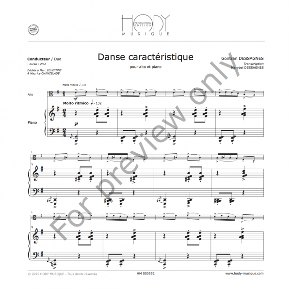 Cette pièce est une transcription pour alto et piano, récemment effectuée par la fille du compositeur, Marybel, à partir de l'œuvre éponyme pour violon et piano. Écrite à Alger en 1959, elle est dédiée au duo de chambristes formé par Marc Eychenne et Maurice Chancelade, qui étaient tous deux élèves au Conservatoire d'Alger alors que Gontran Dessagnes en était le directeur depuis 1946. Marc Eychenne obtint en 1954 le Grand Prix d'Alger pour ses performances de violoniste. Il fera une très belle carrière comme soliste de musique de chambre en France à l'ORTF à partir de 1963 et continuera la composition, pratique dans laquelle il s'épanouira dès l'âge de douze ans. Notons que Marc Eychenne sera aussi le créateur du Concerto pour violon et orchestre écrit en 1950 par Gontran Dessagnes, sous sa direction. Quant au pianiste Maurice Chancelade, il obtint au Conservatoire d'Alger plusieurs prix. Il entreprit aussitôt une longue collaboration avec Marc Eychenne. Pendant plusieurs années, il accompagna à la radio et la télévision les grands violonistes. La Danse caractéristique est une pièce enlevée, difficile car rapide et faisant appel à la technique du spiccato à l'archet. Les quintes enchaînées évoquent les violoneux des villages, les danses d'appuis comme les quadrilles. L'arrangement pour alto doit préserver la virtuosité, le caractère incisif, la précision avec les nombreux échanges staccatos du piano.