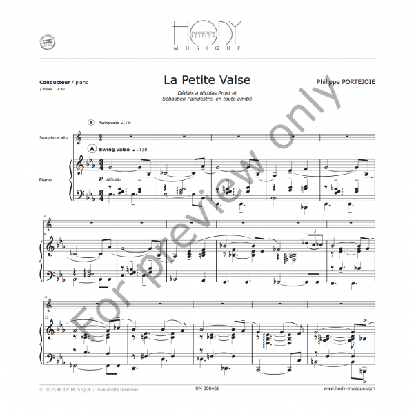 « Dédiée à Nicolas Prost (Saxophoniste) et Sébastien Paindestre (Pianiste), cette courte pièce a été écrite pour être agréable à l’oreille et donner du bonheur. Le swing de « La Petite Valse », donne envie de danser avec son instrument et de s’initier, un peu, au jazz ».